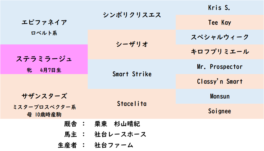 サザンスターズ産駒なのになぜステラ?と思ったが、イタリア語で「星」という意味らしい。なおステラおばさんはアメリカ出身で、ステラおばさんのクッキーは日本発祥。これ豆ね。