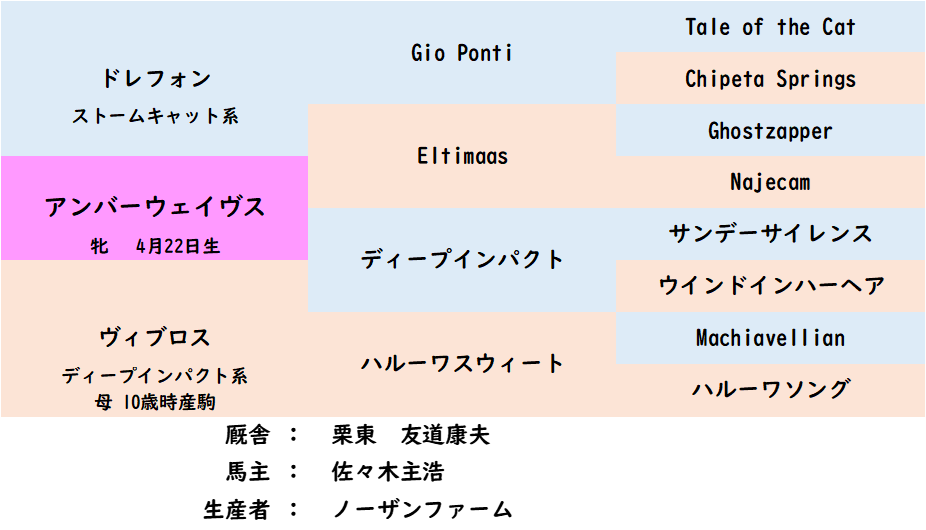 本馬の父はドレフォン。父の3代母が持つ欧州スタミナが、母の欧州スタミナに反応している点と、Mr. Prospectorのクロスが発生する点では相性が良い。ただ母の本質であるHaloの機動力と、父の本質であるである米血パワーが嚙み合っておらず、ここが物足りない。言うなれば、父は筋肉質なマッチョマン、母は非力なお嬢様タイプという、佐々木主浩×榎本加奈子のような配合である。