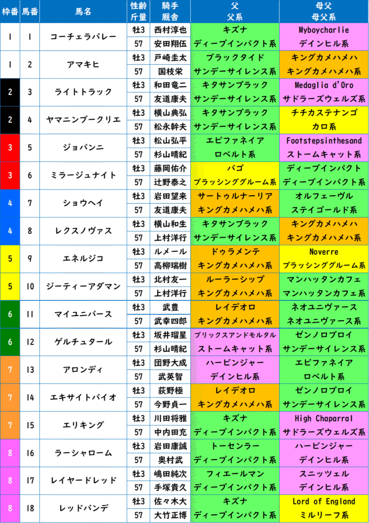 - 高速馬場のスピード決着では差しが決まるが、時計がかかるスタミナ決着では先行馬が残る。今年は稍重馬場で先行できるスタミナ馬を狙いたい。人気のエネルジコは3戦連続で出遅れており、差しに回ると信頼度は落ちそう。