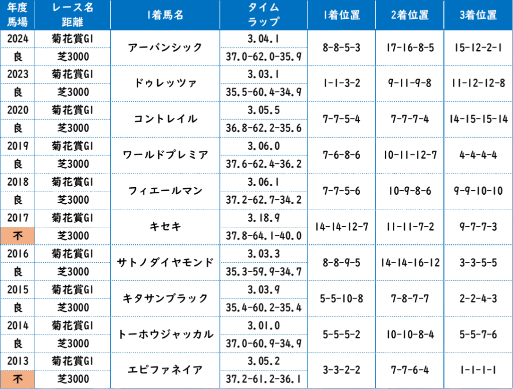 今回の参考動画は不良馬場になった2013年菊花賞。勝ったエピファネイアが強いのは当然として、後方待機組が全く伸びていないことがわかる。先行するか、4角でマクれるスタミナ馬が合いそう。