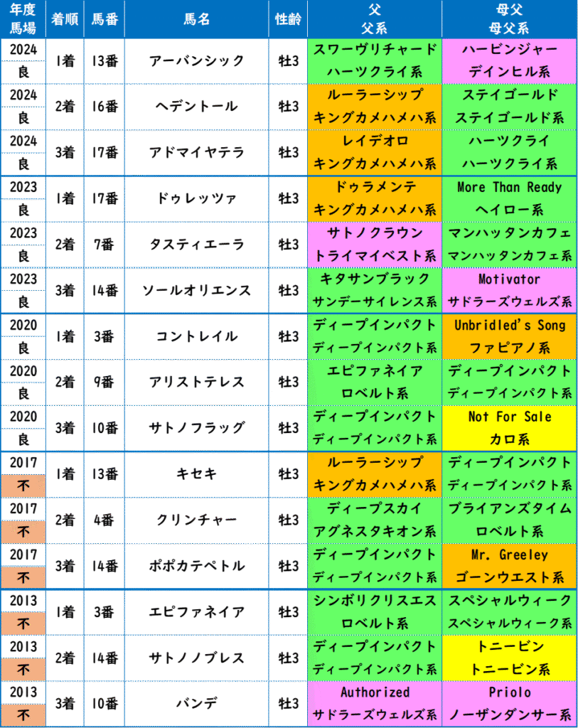 - 良馬場・不良馬場ともスタミナ血統が強い。Roberto系、Nijinsky系が特注。Sadler’s Wells系、欧州ナスルーラ系も合う。