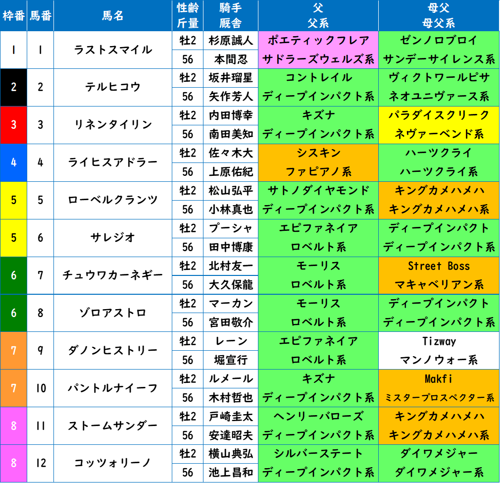 サトノダイヤモンド産駒で、特注血統・ディープインパクト、トニービンを持つ。血統はかなり合う。米血スピードがなく、スピード勝負になると分が悪いが、欧州スタミナは豊富なタイプで、前が崩れれば確実に差し込んでくるはず。後方になりすぎなければ。