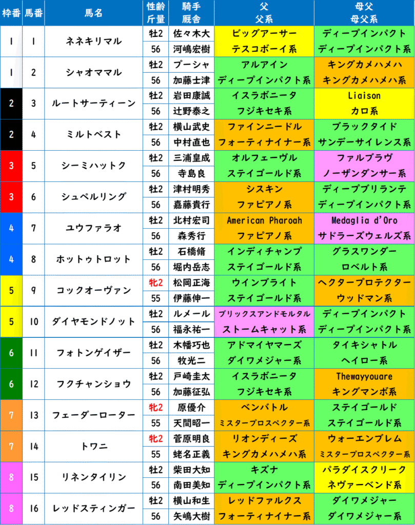American Pharoah産駒で、特注血統・米国ミスプロ、Danehill+Storm Catを持つ。血統はドンピシャ。ハナを奪う先行力がありつつ、道中溜めて粘れるため、レース質もピッタリ。連戦かつ連続の輸送があり、目標にされるのも微妙だが、力を出し切れば粘り込める。