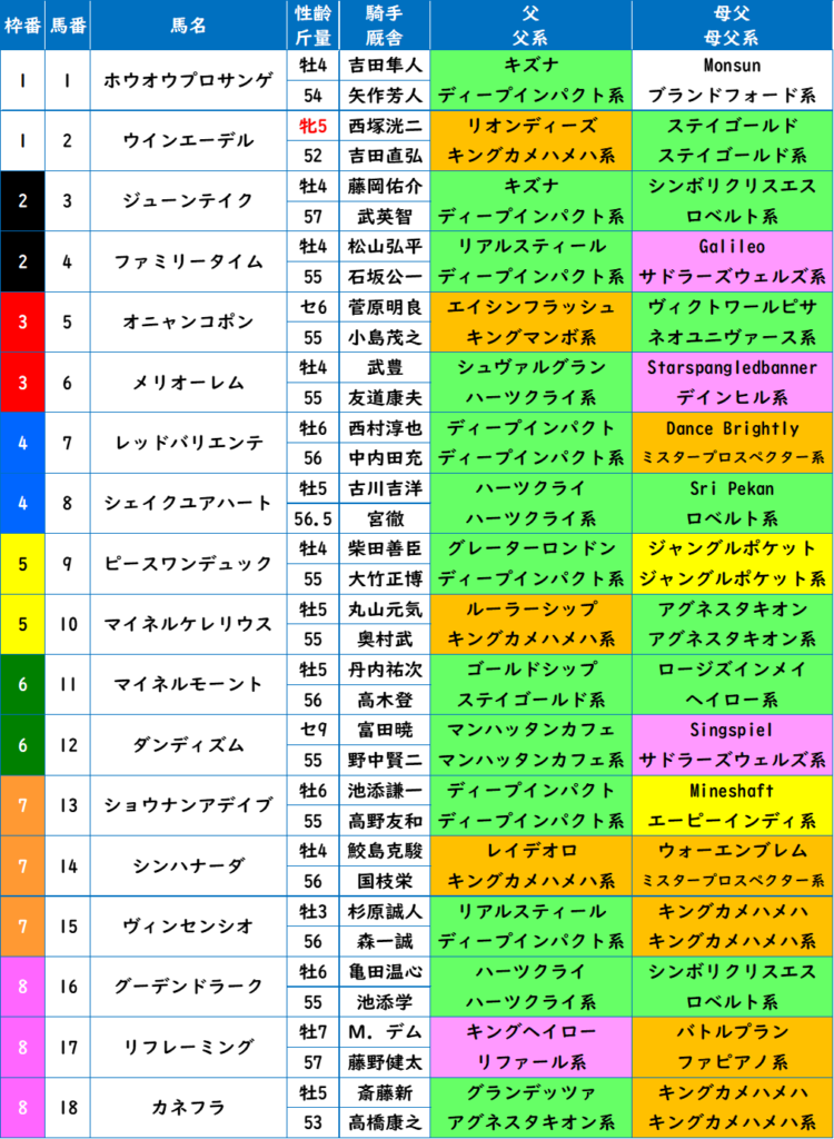 - 枠順は内枠が有利。インの馬場が良いので、内をピッタリ回る差し馬に注意。