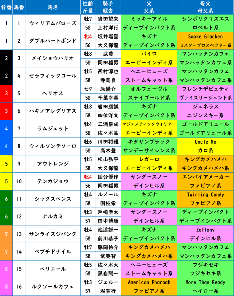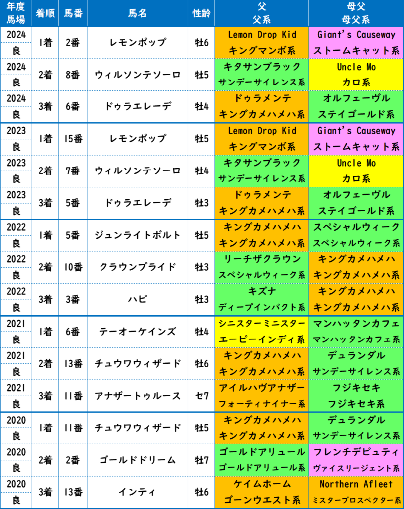- リピーターレース。掲示板に載った3頭、ウィルソンテソーロ(2着)、ハギノアレグリアス(4着)、ペプチドナイル(5着)には要注意。