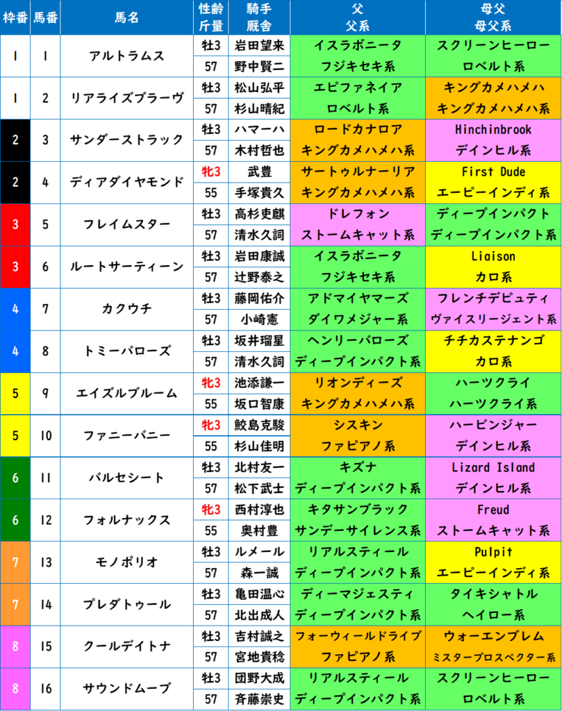 キタサンブラック産駒で、Storm Catを持つ。血統はまあまあ。この馬は溜めが利かないタイプなのでマイルへの短縮は向くし、中間もかなり上積みがありそう。穴人気だが押さえは必要。