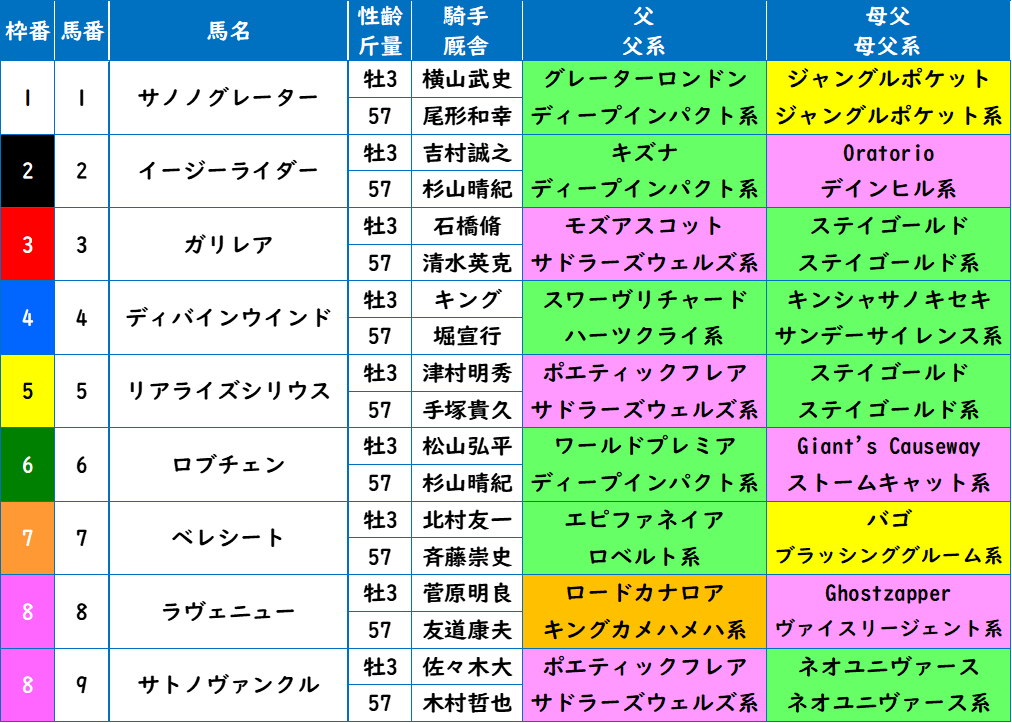 キズナ産駒で、ディープインパクトを持つ。米血スタミナが少なく、血統はあまり合わない。4歳世代トップクラスの能力を持つし、中間の動きも悪くないが、追い込み馬でもあり安定感はない。勝ち切れずの2-3着あたりなら。