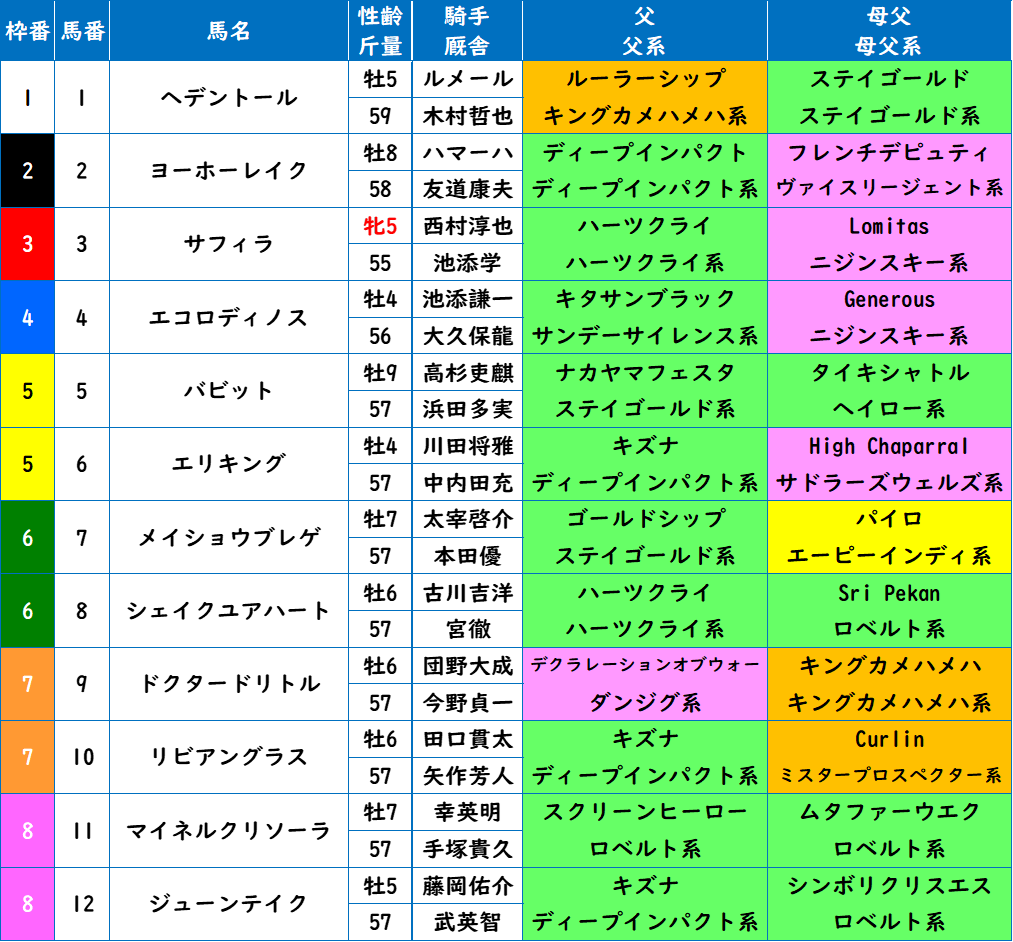 ロードカナロア産駒で、特注血統・キンカメ、Storm Catを持つ。米血中心の構成で血統はあまり合っていない。この馬はミドルペースの上がり5F競馬が合うタイプで、スローのキレ勝負になると分が悪い。これで1人気ならバッサリ切って、複勝・ワイドでリスクヘッジする形にしたい。