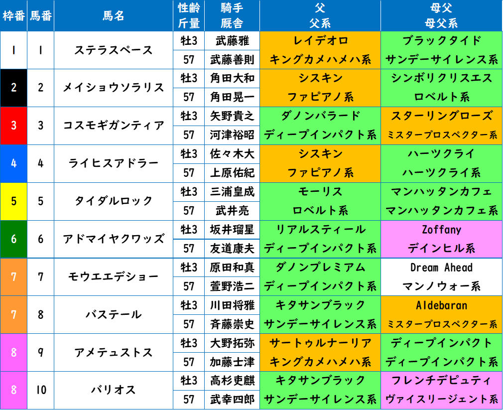 レイデオロ産駒で、ブラックタイドを持つ。血統はまあまあ。今回は逃げ馬不在で、逃げそうなのはこの馬とメイショウソラリスだが、メイショウは前走掛かっただけ。この馬がすんなりハナを奪って、自分のペースから早めスパートなら、展開は最も向く馬。また前3走は強行軍で調教も軽かったが、今回は中間でウッドの自己ベストを更新。京成杯からの上がり目も期待できる。
